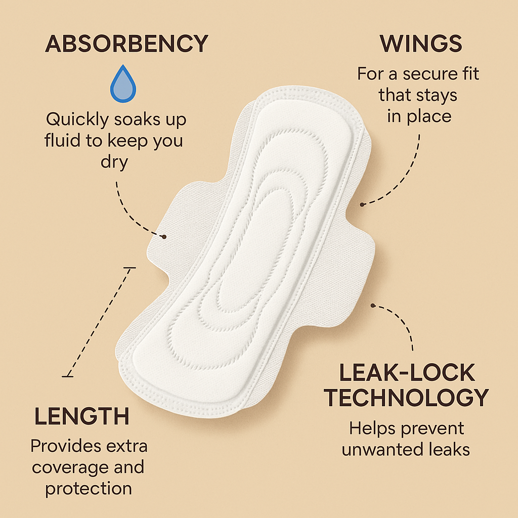 [Image prompt here: Infographic showing pad features – absorbency, wings, length, and leak-lock technology.]
